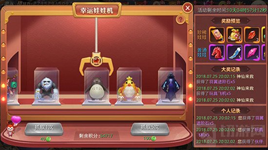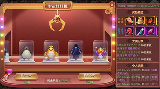 在游戏活动期间,道友每抓取一次娃娃就需要消耗40积分券,稍微贵了一些,小编推荐玩家可以通过累计积分用来连续抓取五次娃娃,只要100积分卷哦!可以说是相当的良心。娃娃机内共分为普通娃娃与珍惜娃娃两种,珍惜娃娃包装华丽与众不同,奖励自然不是普通娃娃可以比拟的,可遇不可求,看见之后可要赶紧下手!