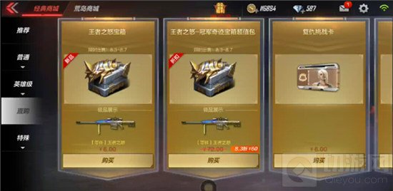 与其他王者级获得方式相同,小伙伴们无法在商城直接购买,而是来到直购页面,购买相应的宝箱,才能获得对应的武器。以王者之怒宝箱为例,单个的价格为6元,可能开到王者之怒碎片,100钻石,复仇者挑战卡,以及永久版的王者之怒。旁边的冠军奇迹宝箱也是如此,只不过是把100钻石替换成了王者之怒的专属皮肤版。虽说这其中能够直接开到王者之怒永久版,但是难度极高,除非小伙伴们非常幸运,否则只能老老实实的收集碎片了。