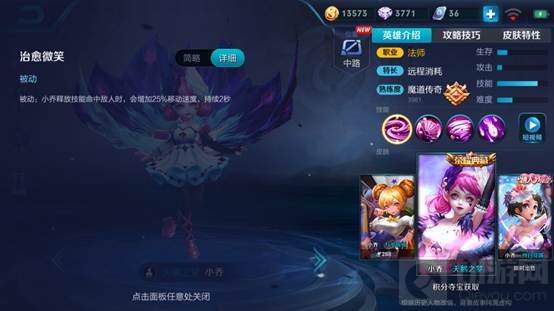 被动:治愈微笑——小乔技能释放命中敌人时增加持续2秒25%的移动速度。