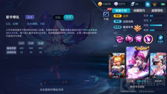 三技能:星华缭乱——小乔召唤持续五秒的流星并不断向附近的敌人坠落,每颗流星会造成400点法术伤害,同一个地方英雄最多承受四次攻击,且命中的同一英雄时,从第二颗流星开始,将只造成50%的伤害。