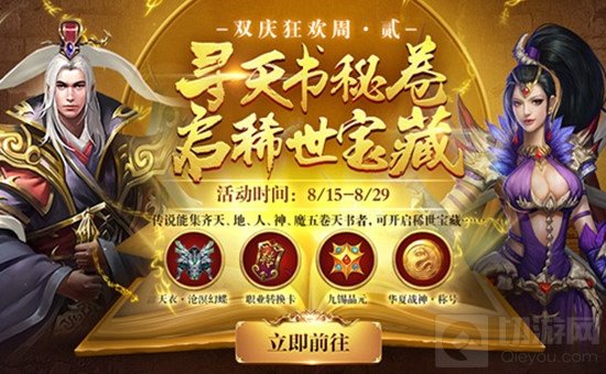 继天羽出山礼、欢庆公测?活跃福利等精品福利的亮相过后,8月15日,玩家还将迎来天书宝藏、双庆?充值回馈、七夕?鹊桥祈福等多重福利,在8月15日至8月29日期间,玩家每天登录游戏并达到指定活跃度,就可获得天书秘卷参加天书宝藏活动。玩家在活动页面开光后就可随机获得天书五卷中的一卷。集齐指定数量后就能领取绝版永久天衣-沧溟幻蝶、绝版纪念称号-华夏战神、5档图鉴、九锡晶元、乾坤宝图等超丰厚福利。另外,玩家还可以利用赠送和索要功能,同好友完成各秘卷的交换,从而尽快完成收集。