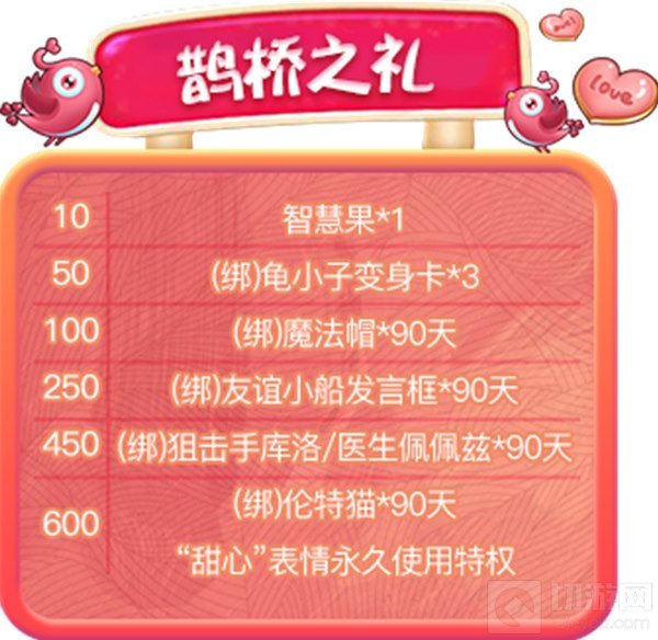活动内容:活动期间,让我们一起满足牛郎和织女相会的愿望吧!所有小伙伴每增长100积分,就能获得一只“喜鹊”,“喜鹊”属于讨好道具,每接收一只喜鹊,可以为自己增加1积分。
