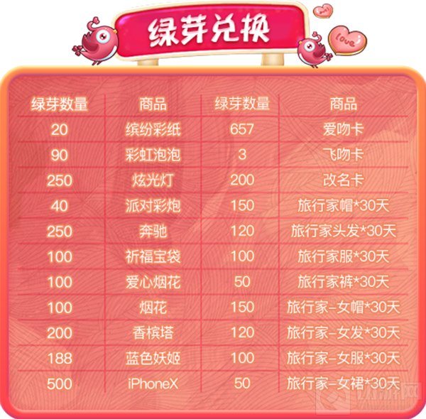 活动内容:你想要的,都在这里!活动期间,使用绿芽可兑换琳琅满目的甜蜜商品,还有全新套装:【旅行家】等你来收获哦!