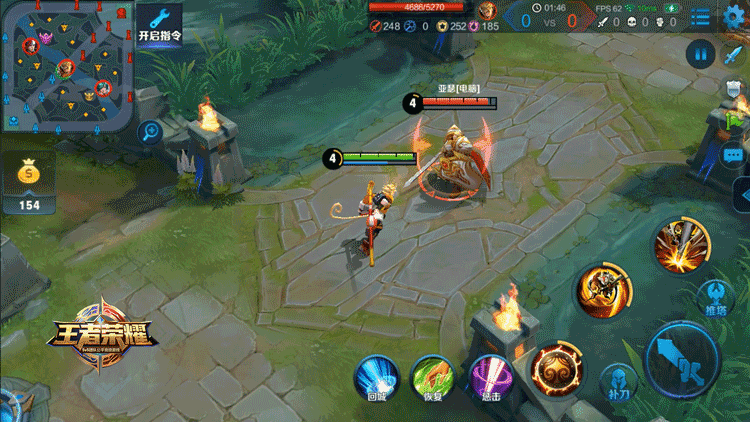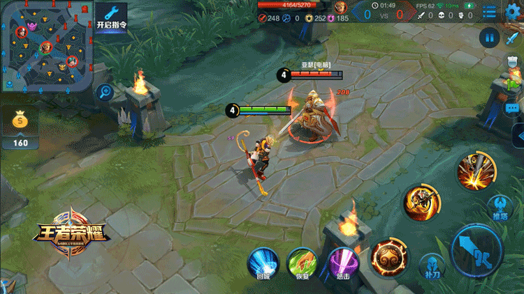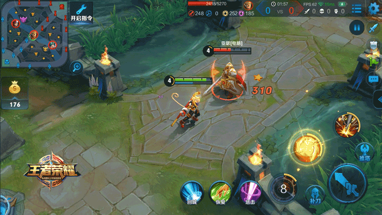 孙悟空使用二技能“斗战冲锋”,只见他一个街头跑酷的跟斗朝目标方向翻去,举起金箍棒打出强化普攻时,会随机变成的大锤子/无尽之刃/路牌朝目标敲击,路牌上面还印着嘲讽作用的禁止“AFK”标志(意思是电子竞技没有暂离),可以说相当有电竞精神了。