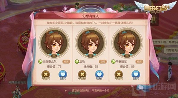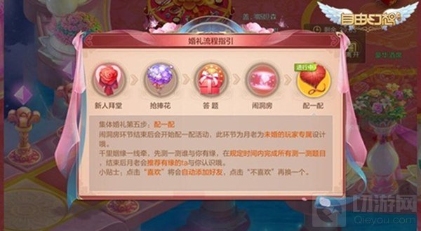这是属于婚礼现场单身玩家的专属环节。玩家们完成5道“测一测”题目,月老NPC将根据你的答案,为你配对一批有缘异性玩家——点击“喜欢”将会申请添加好友,点击“不喜欢”再换一个,玩家们一起来寻找你命运中的幻想有缘人!