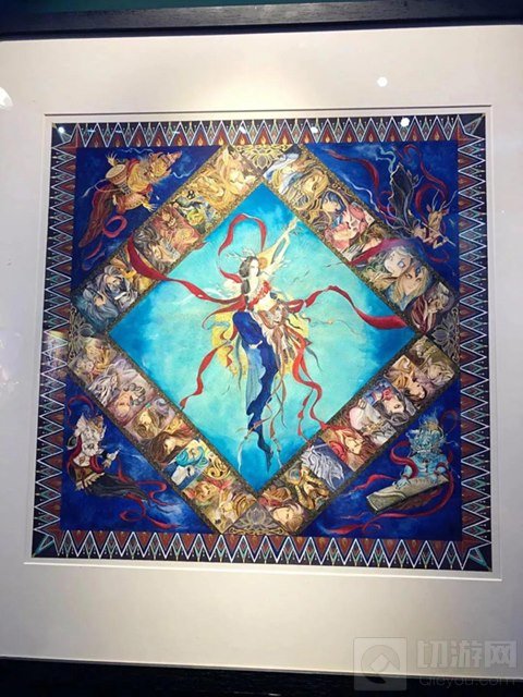 这幅画名为《敦煌舞乐》,以正方敦煌藻井为载体,杨玉环反弹琵琶飞天舞蹈,四大莫高神兽伴乐。最巧妙的是,周围有32位王者英雄守卫四方,照应了游戏里的ban位页面。