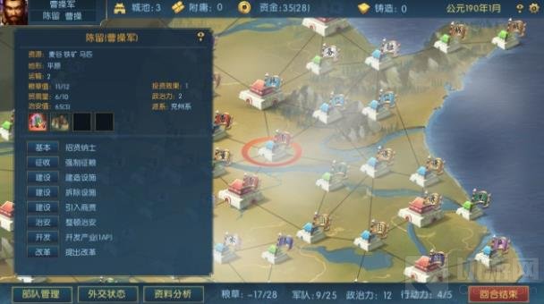 内政系统比较简单,五大块:征收、建造、投资、整顿和开发,界面和功能都简洁易懂,很快就能摸透——核心目的就是猥琐发育存资源。