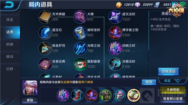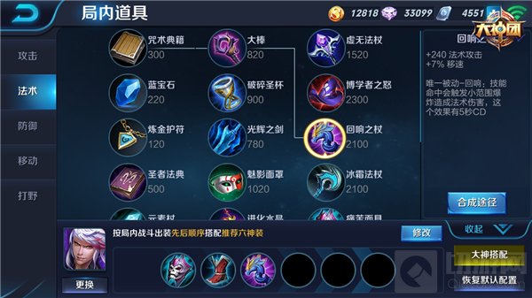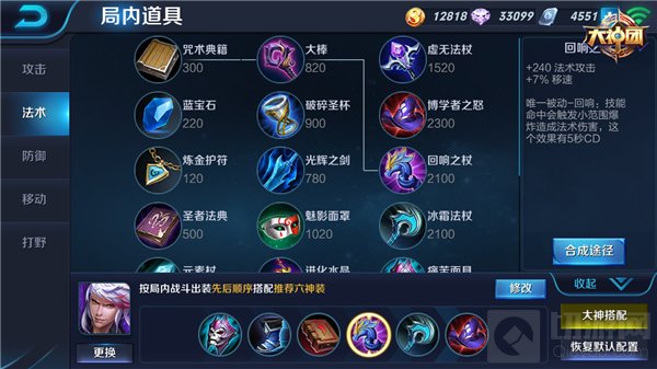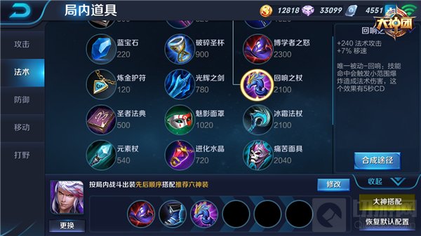 中期装备的选择对后期的战局发展较为重要,纯输出出装先选择出大棒合成博学者之怒,该装备的固定属性增加高渐离较多法术攻击,被动效果更增加整体35%法术强度百分比,可大大增强高渐离的输出能力;选择回响之杖增加高渐离法术攻击同时增加移速,结合被动效果释放时触发小范围爆炸的效果,都与高渐离技能的增加移速和群攻特性紧密结合,可以让高渐离的优势再度提升;鞋子选取秘法之靴,增加法术穿透能力让高渐离的法术攻击对敌人造成更高的伤害。
