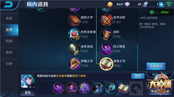 从王昭君是法师这个角度来看,出门装我们选择咒术典籍,加强王昭君开局在中单的对线能力。但同时王昭君本身没有位移,血量又少,我们也可以先选择蓝宝石,提高法力,然后可以合成进化水晶,提高法力值和生命值,而进化水晶更重要的作用,我们会在下一段讲到。