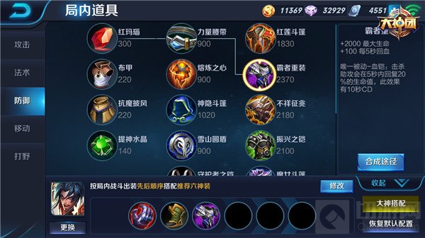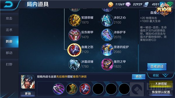 中期的出装一样分为两种,纯肉出装的核心是血魔之怒,霸者重装和影刃之足。其中血魔之怒可以增加项羽较多的生命值和少量的物理攻击,被动效果在生命低于30%更可以再度提高攻击力的附加和产生护盾抵挡伤害,是项羽攻防一体的核心装备;霸者重铠可提高巨额的生命值和回复速度,同时让项羽在协助队友击杀或助攻的情况下快速回血,愈战愈勇;鞋子选择影刃之足可以扛住敌方的伤害,让项羽的物防能力更强。