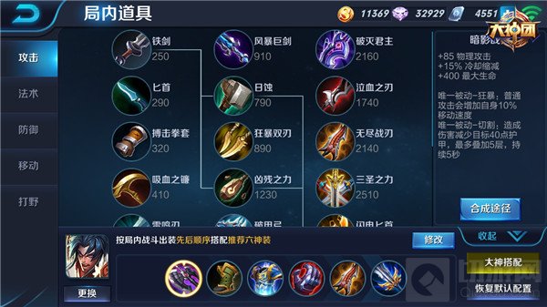 半肉型项羽的中期装备通过前期购买凶残之力合成暗影战斧,增加项羽的生命值、物理攻击、物理穿透和技能冷却CD缩短,让项羽的攻击能力更加突出,可以穿透敌方护甲对敌方造成拳拳到肉的伤害,同样选择搭配血魔之怒,这件攻防一体的装备让项羽输出能力再提高的同时让项羽的生命值得到增加,保证项羽的生存;最后鞋子依然选择影刃之足,便于项羽冲锋抵挡敌人的伤害。