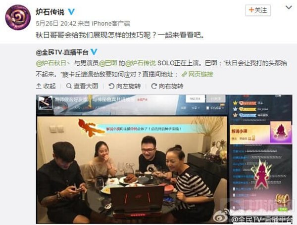 这场娱乐圈与网络主播的炉石对决不仅在全民TV平台上吸引了近300万用户的在线围观,也引起了《炉石传说》官方微博的关注,并且对赛事进行了 “秋日哥哥会给我们展现怎样的技巧呢?一起来看看。”的转载评论,秋日“炉石主播第一人”的影响力也在为他带来丰富的资源和空间,正如他所说网络游戏主播只是一个起点,未来行业会走向什么方向,没人可以断言,但是他会和他娱乐圈的明星朋友一起跨界玩儿直播,希望通过他的努力,能将网络直播主播身份,让更多人知道,也据他透露,在之后的直播中会有更多重量级的明星嘉宾不断出现,真正打通传统娱乐圈和线上娱乐圈的通道。