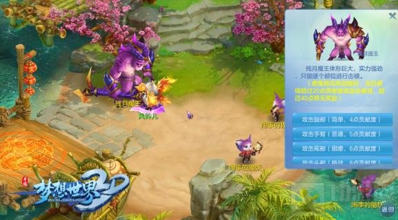 中秋节竟有残月魔王捣乱,梦想大陆的侠士们第一个不答应。9月22日至24日每天10点至24点,等级≥30级的少侠组成五人队伍即可参加,活动期间,每个整点残月魔王会随机出现在梦想大陆某个地方,且每过5分钟会更换1次位置。每次第一支找到残月魔王的队伍,其队长将获得额外奖励。找到残月魔王后,可以选择魔王身体的一部分进行挑战,部位不同,难度也有所不同,难度越高则奖励越高。中秋节,快来梦想大陆驱赶魔王吧!