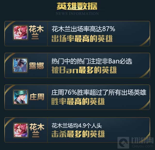 本场赛事中,露娜是最受欢迎的英雄,庄周成为了所有出场英雄中最高的英雄,高达76%,花木兰成为出场率最高的英雄,达到87%,同时以场均4.9个人头成为本次赛事中击杀最多的英雄。