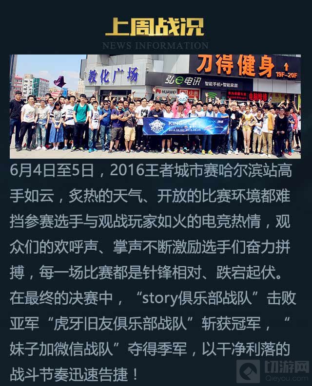 6月4日至5日,2016王者城市赛哈尔滨站高手如云,炙热的天气、开放的比赛环境都难挡参赛选手与观战玩家如火的电竞激情,观众们的欢呼声、掌声不断激励着选手们奋力拼搏,每一场比赛都是争锋相对、跌宕起伏。在最终的决赛中,“story俱乐部战队”击败亚军“虎牙旧友俱乐部战队”斩获冠军,“妹子佳微信战队”夺得季军,以干净利落的战斗节奏迅速告捷!
