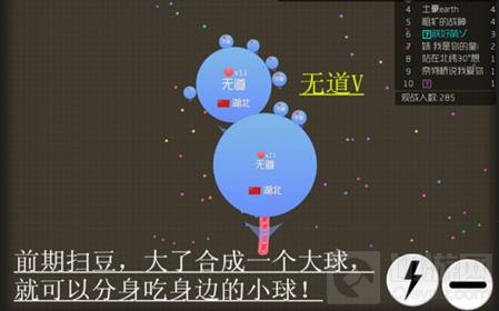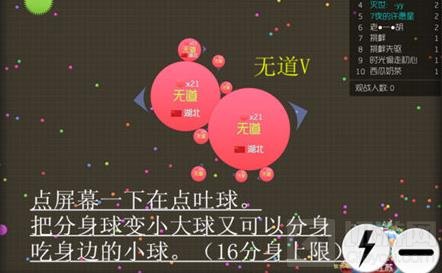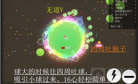 球球进去到能碰刺的时候旁边有大球与小球在身边的时候,这时候就需要吐球分身吃小球跑路。这样就可以走在吃些豆球就变大了。