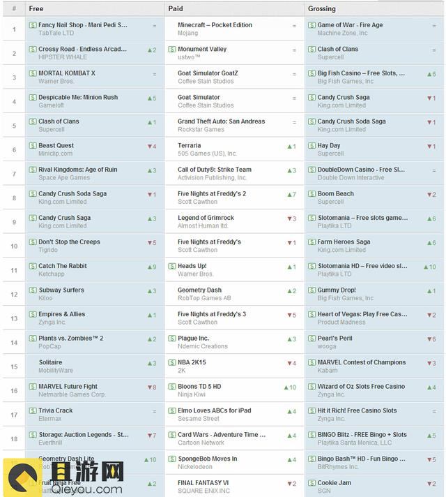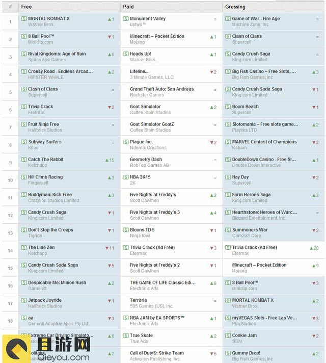 免费游戏排行榜方面,华纳兄弟推出的《真人快打10》(MORTALKOMBATX)由上周的第三名又上升到了本周第一名,由Miniclip.com开发的美式台球游戏《霹雳八球》(8BallPool)则成为了本周免费游戏榜的第二名,跟在它后面的是策略战争类游戏《竞逐之国:毁灭时代》。《天天过马路》(CrossyRoad)与《部落战争》则分别排在第四名和第五名的位置上。