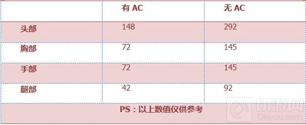 根据上述信息,我们可以看出:无AC条件下,除命中腿部需补刀外其他皆一枪毙命;有AC状况下,除头部无条件出局外其他皆需等待第二击。