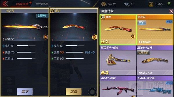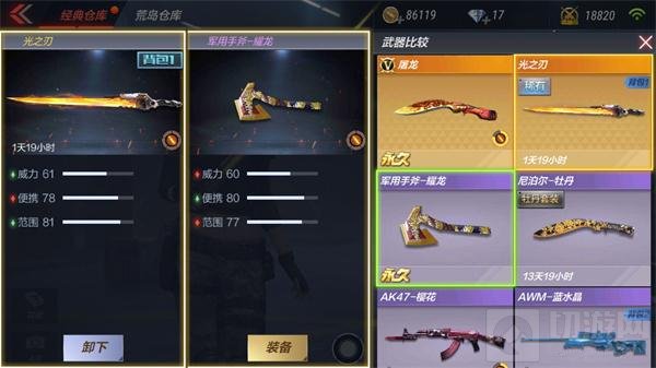 如图,光之刃和军用手斧-耀龙相比,前者威力和范围高于后者,便携低于后者,即:论输出伤害和攻击距离,前者占优;论行动速度,后者占优。