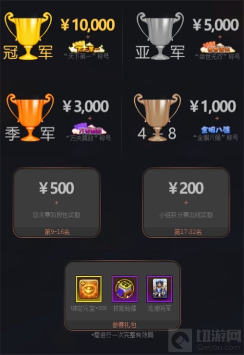 第六届武道会赛事奖励大幅升级,冠、亚、季军以及8强不仅可以一战成名,更可以获得现金+专属称号双重奖励,全服9-32强亦可按排名获得百元现金奖励。报名参赛无论输赢(需进行一场完整有效局)即可获得参赛大礼包,内含:绑定元宝*300,技能秘藏*1,赵云-龙胆将军皮肤,参赛奖励就是这么豪气,只要参赛就能获取!