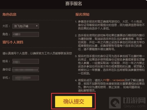 2、在赛事报名页选定所属大区和角色,正确填写个人信息,并确认提交报名信息。