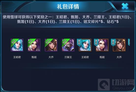 使用魔法雪球有机会可以得到王昭君、甄姬、大乔、兰陵王的永久英雄、英雄体验卡、钻石/铭文碎片。目前版本中王昭君这个英雄是有极高的热度的,而且这个英雄目前版本的出场率和胜率也是极高的,个人推荐大家兑换王昭君。