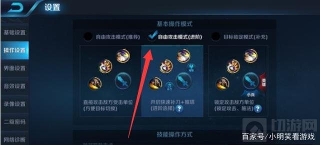 第一个是操作模式,相信很多玩家在选择游戏模式的时候,大多数玩家都会选择自定的自由模式吧,其实使用这个模式登上王者并没有那么快,可以试一下自由攻击模式,这个模式玩熟练后可以直接对方的英雄和小兵,能节约很多时间,只要操作的好胜的概率还是很大的。