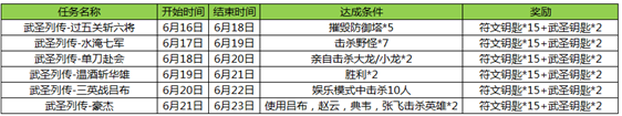 武圣列传任务选取武圣的6件生平大事,每个任务有3天完成时间,完成后可以获得铭文碎片及武圣钥匙*2(活动期间每个任务仅能完成一次)。