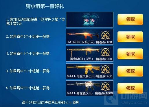 3.如果猜中4个小组第一获得黄金MG3(3天)、200精通点
