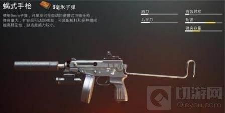 蝎式手枪使用9mm子弹,拥有单发、全自动两种模式,可装配握把、枪托的微冲锋手枪,将在全地图刷新出现。蝎式手枪的配件卡槽将有五个之多,在近战中的威力可以媲美主力武器。满配的蝎式手枪将拥有40发的弹夹容量和极佳的操控性,配合“冲锋手枪”默认的高射速,无疑将成为了近距离交火中的利器。“手枪”的枪械定位也使得蝎式手枪无法对于中远距离的目标构成有效威胁。毫无疑问,蝎式手枪的出现将极大改善游戏中手枪武器“鸡肋”的尴尬位置。