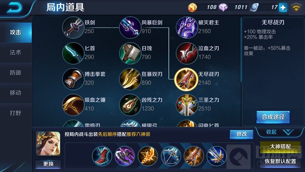 后期神装:暗影战斧—冷静之靴—闪电匕首—无尽之刃—破甲弓—破军