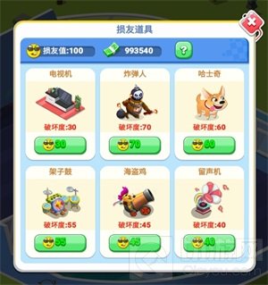 损友道具包括电视机、炸弹人、哈士奇、架子鼓、海盗鸡、留声机共六种,不同道具所能造成的破坏程度不同,且购买所需的损友值也不同。损友值可以通过向其他玩家投放小恶魔、坏蛋、嗜睡等互动玩法获得。