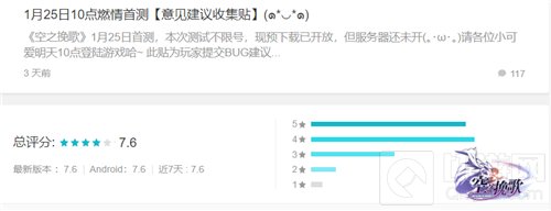《空之挽歌》在2018年曾获得“黑石奖”最受期待手游奖,自游戏25号开启测试以来,测试服务器人数爆满,收获了许多来自治安官们的好评与鼓励,首测当日Taptap《空之挽歌》测试服评分突破7.6分。