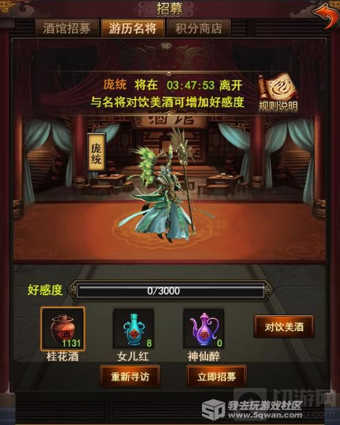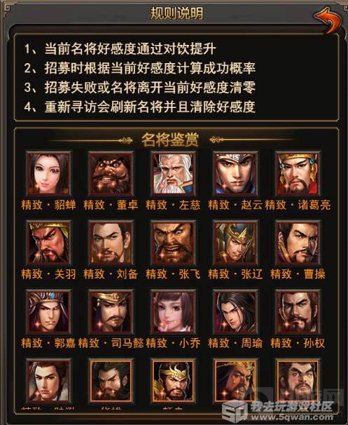 游历名将固定24小时刷新一次,随机出现目前游戏中所有的五星武将,包括普通和精致,也就是说你想要的武将都有可能通过这里出现,不过需要与其饮酒提高好感度才能够顺利招募,好感度越高招募的成功率也就越高,但是为了避免意外,还是把好感度刷到百分之百再去招募比较好。
