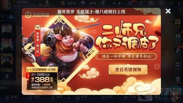 而新英雄猪八戒将在1月30日上架,需要13888金币或58英雄碎片兑换,该英雄定位全肉坦克,依靠自身最大生命值来输出,在技能机制上有一定的可玩性。