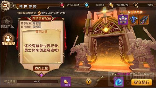 勇者大陆的创世神殿总共5层,封印之门等你开启。提交【创世水晶】可加速封印解除的速度,同时获得创世积分。创世积分达到指定额度后可获强化材料奖励和绝版”救世主”称号。每一层创世神殿的解封奖励是独立的,本层创世神殿封印解除之后,无法再本层获得解封奖励。