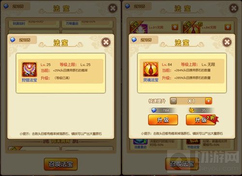 不过需要注意的是,狩猎法宝最高25级,而灵魂法宝等级是无限的,这里小伙伴们就需要合理地分配一下资源啦~建议小伙伴们优先升满狩猎法宝,灵魂法宝可以根据进度适当升级,毕竟原石的来源也不止打BOSS一种方法!只要合理升级这两种提高原石产量的法宝,就可以为小伙伴们换来大量战力,打倒BOSS也会更加容易!
