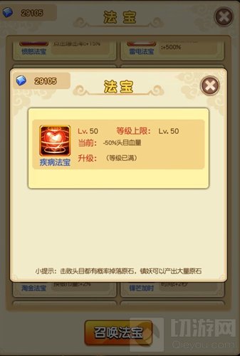 这克星之一就是疾病法宝,它的作用非常简单粗暴,就是削减头目一定的血量。由于《新葫芦娃》里的敌人都不会攻击玩家,血量就成了衡量怪强弱与否的唯一标准,这样一来,疾病法宝就等于大幅遏制了BOSS的战斗力。当然,这么厉害的法宝等级是有限制的,满级为50级,不过这样就很容易升满。满级后可以降低魔王50%的生命!BOSS克星非它莫属了!