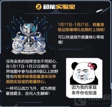 从1月17日~1月21日,游戏内还将上线能量源极品级璀璨礼包,而在1月17日~1月22日,参与击杀世界地图中8级以上野怪也会掉落能量源,把握先机,必将抢先制敌!