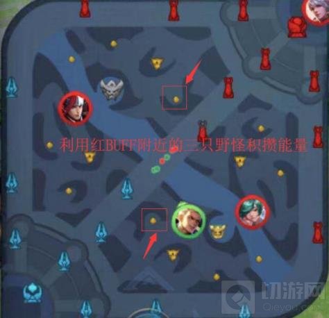 ②开团时如果能量不足,可以利用周围的野怪以及兵线进行能量积攒。红buff附近的三只野怪,能给狂铁带来两格能量,是一个很好的能量积攒点,记得和队友沟通留这三只野怪。如下图: