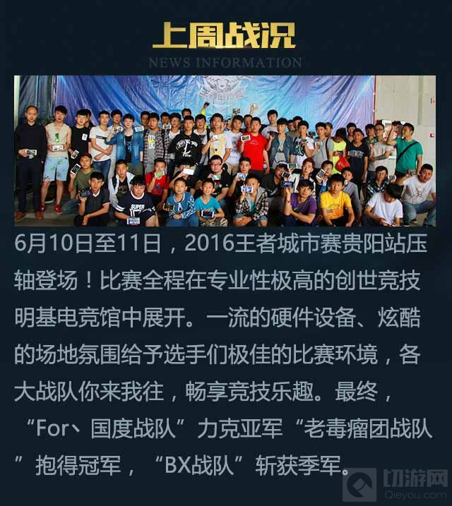 6月10日至11日,2016王者荣耀王者城市赛贵阳站和北京站压轴开赛。贵阳站比赛全程在专业性极高的创世竞技明基电竞管中展开。在如此一流的环境下,最终“For、国度战队”斩获冠军。