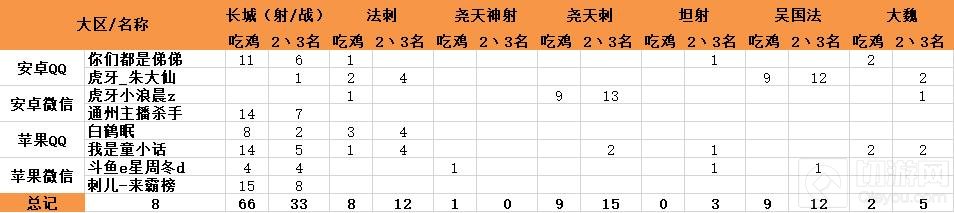 注:样本选自四个物理大区,大区排名无优先。玩家按照小区排名依次选择,如果隐藏战绩则推后。总记四个物理大区,八名国服玩家,七种阵容,战绩样本175个。没有出现的阵容就不单独列出,吃鸡代表第一。