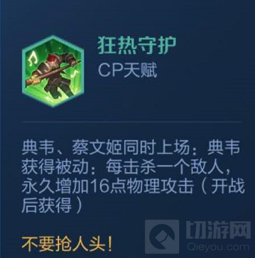 狂热守护是阵容核心,来得越多越好,能量之域对于辅助阵容的提升也挺高,其他的推荐天赋更多只是辅佐作用,致残之握可有可无,因为只有一个典韦作为战士,主动技能的天赋也能拿一些避免遇到高手被直接抬走。