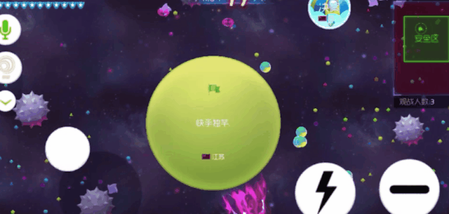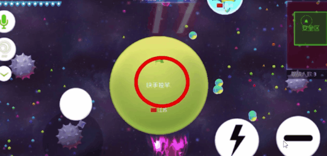 队友控制着四分之一大小的球体藏在自己的肚子里,找到对手旁边的一个刺后队友向刺球旁边分身,自己也同时四分后不出意外的炸刺了。虽然四分炸刺后小分身剧增,但是未达到分身上限。敌人就在旁边,情势十分危急。