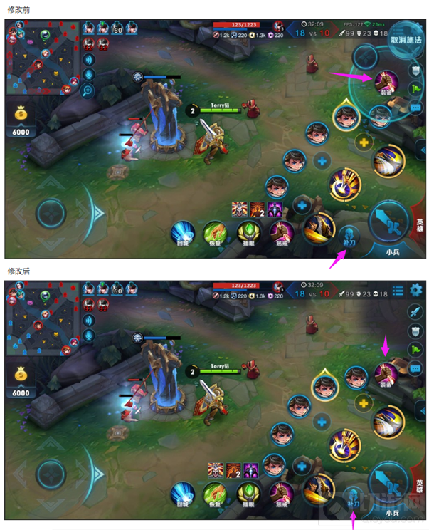 由于在之前的版本中,主动装备的使用位置不顺手,存在补刀键容易误点中1技能的问题,所以我们将主动装备按钮下移,补刀键调整到普攻和1技能之间: