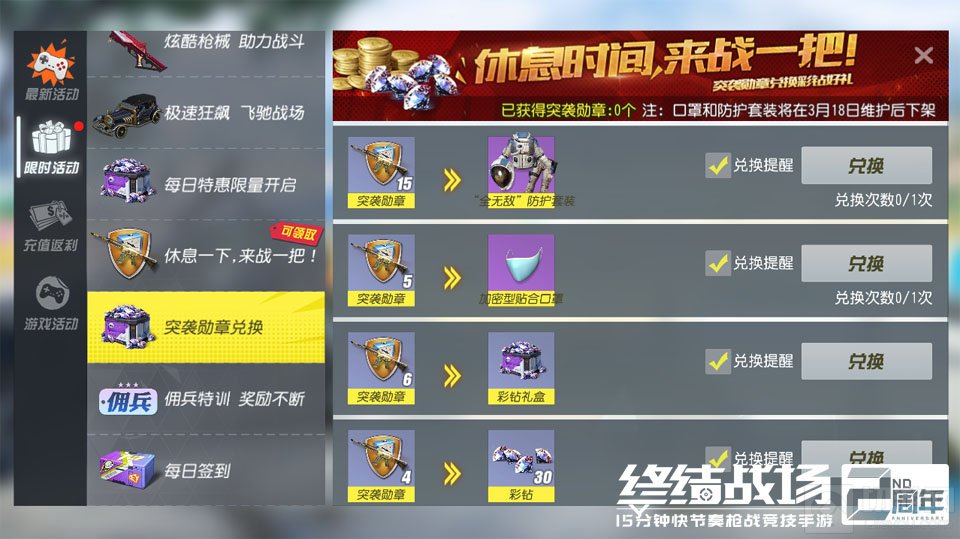 在本周的突袭勋章活动中,玩家获得的勋章可用于限时兑换口罩、防护服等外观,在游戏中也能拥有超强安全感。