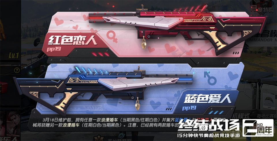 白色情人节预热,本周更新后,玩家可通过抽取枪械补给获得PP19外观蓝色爱人-I与红色恋人-I,感受红与蓝的绝配之美。而在3月4日-3月18日期间抽取枪械补给,还可获得至尊预热大礼——黑暗武士预装礼包,以及海量游戏道具精品。