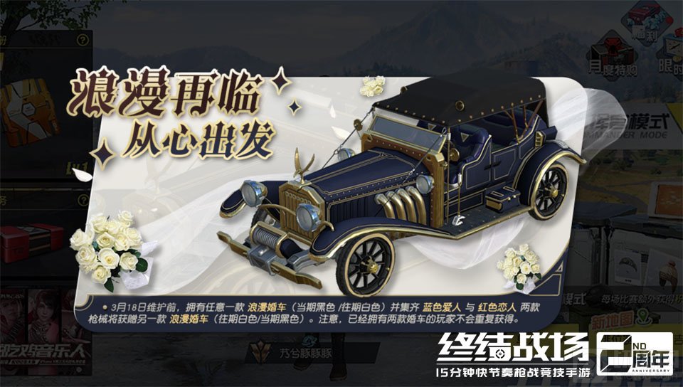 抽取本周载具补给将有机会获得载具外观“浪漫经典婚车”,黑白两色风情各具,让浪漫与庄重完美重叠。截止3月18日维护前,玩家拥有任意一款浪漫婚车并集齐蓝色爱人与红色恋人两款满级枪械,还将获赠另一款浪漫婚车。