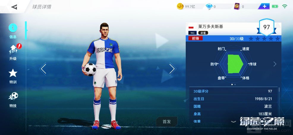 莱万有着锋线全能的能力,是足球场上最优雅的杀手。184的身高,却有着出人意料的身体平衡。在《绿茵之巅》中登场的莱万,位置定位是全能前锋,各项属性虽然不是最顶尖的,却是最平衡的。初始强壮和速度都到达了80+,射门能力方面初始射术91.远射也达到了83.盘带和控球也毫无短板,可以胜任任何阵容和战术。