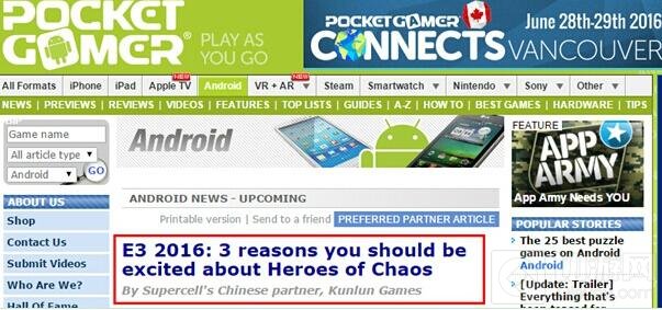 《神魔圣域》在全球陆续开展的测试,引起了海外媒体关注。6月16号,英国知名游戏资讯网站POCKET GAMER以“E3 2016: 3 reasons you should be excited about Heroes of Chaos”为题报道了《神魔圣域》的研发阵容、全球同版发行策略以及优异测试表现。